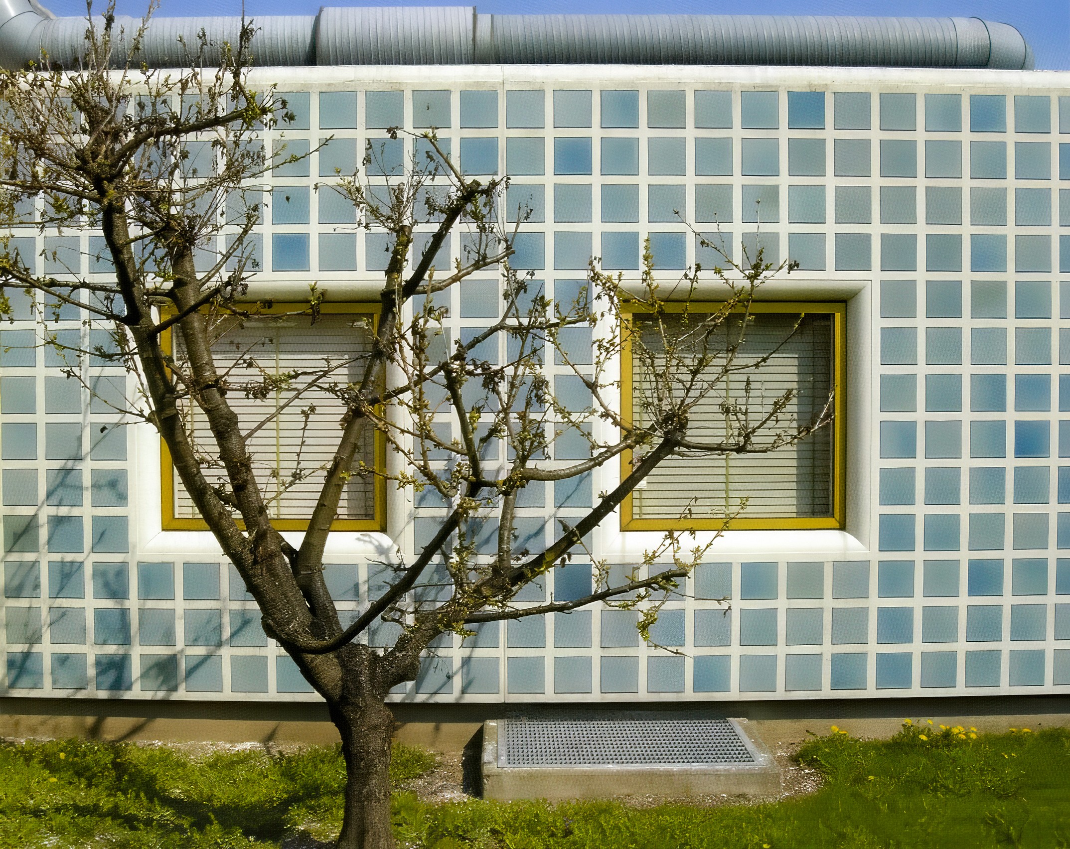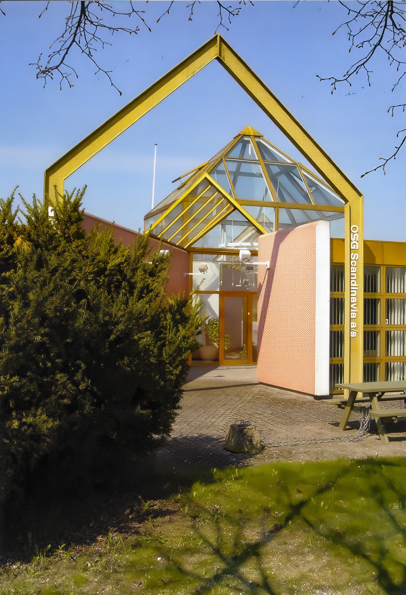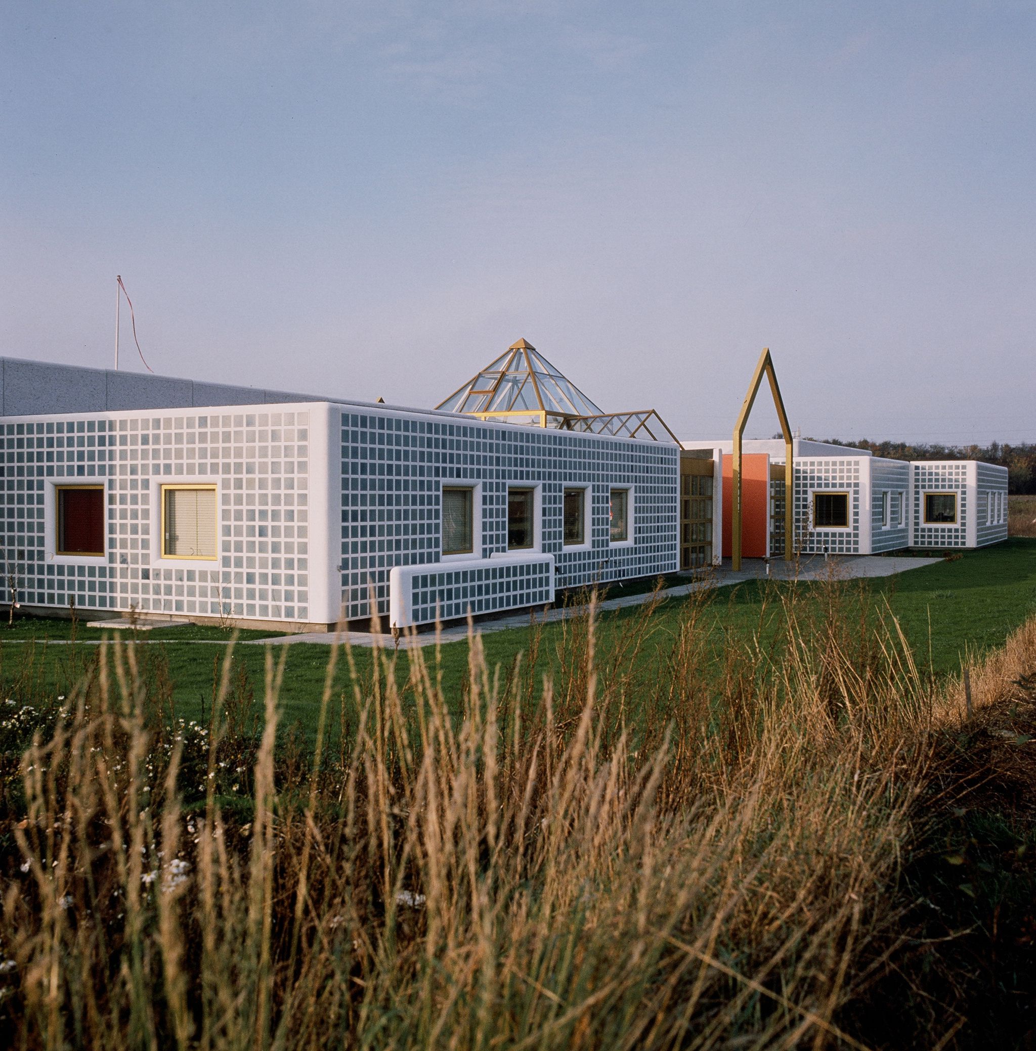 印刷所と機械工具輸入会社が共同で土地を購入し、隣接した建物を 建設した。建物の中央をガラスの入り口で分け、各々の機能に応じた 会社ビルであるが、全体として一体感のあるビルにまとめた。外壁は 白セメントのPC板に寒冷地用タイルを工場で埋め込んで作成した。