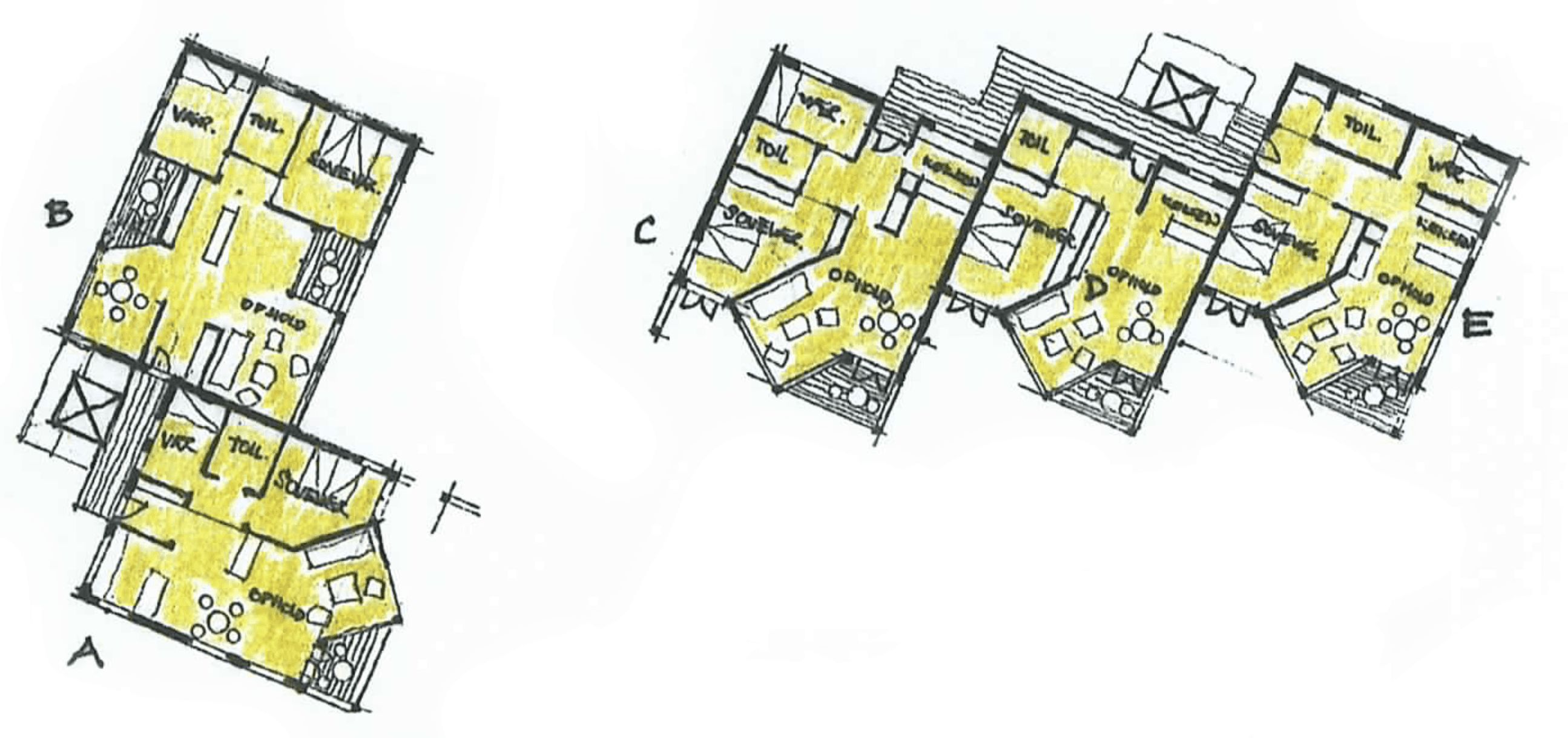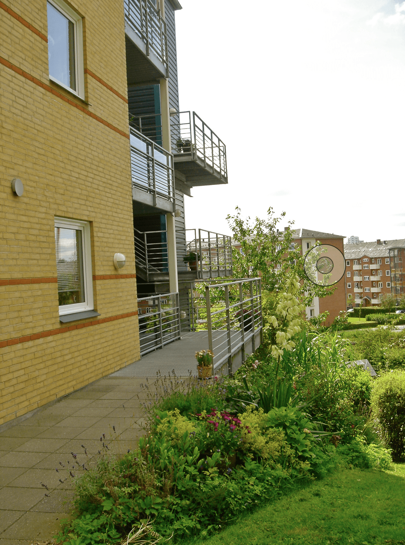 森に沿って歩くとフィヨルドが現れる場所に、少し前まで地方の地ビール醸造所があった。時代の流れで工場は消え、14戸のシニア住宅へと生まれ変わった。各戸のテラスはどれもフィヨルドに向かっている。 自宅を売却して早い時期にコンパクトなシニア住宅に移り住んだシニア達は100㎡の共有するコモンルームを中心に、時々には一緒に料理をしたり、 趣味の集まりを楽しんでいる。広々とした庭の花壇の手入れも、 ガーデニングが好きな有志が行っている。これは元気なシニアの終の住処で、付かず離れずの隣人付き合いがある。